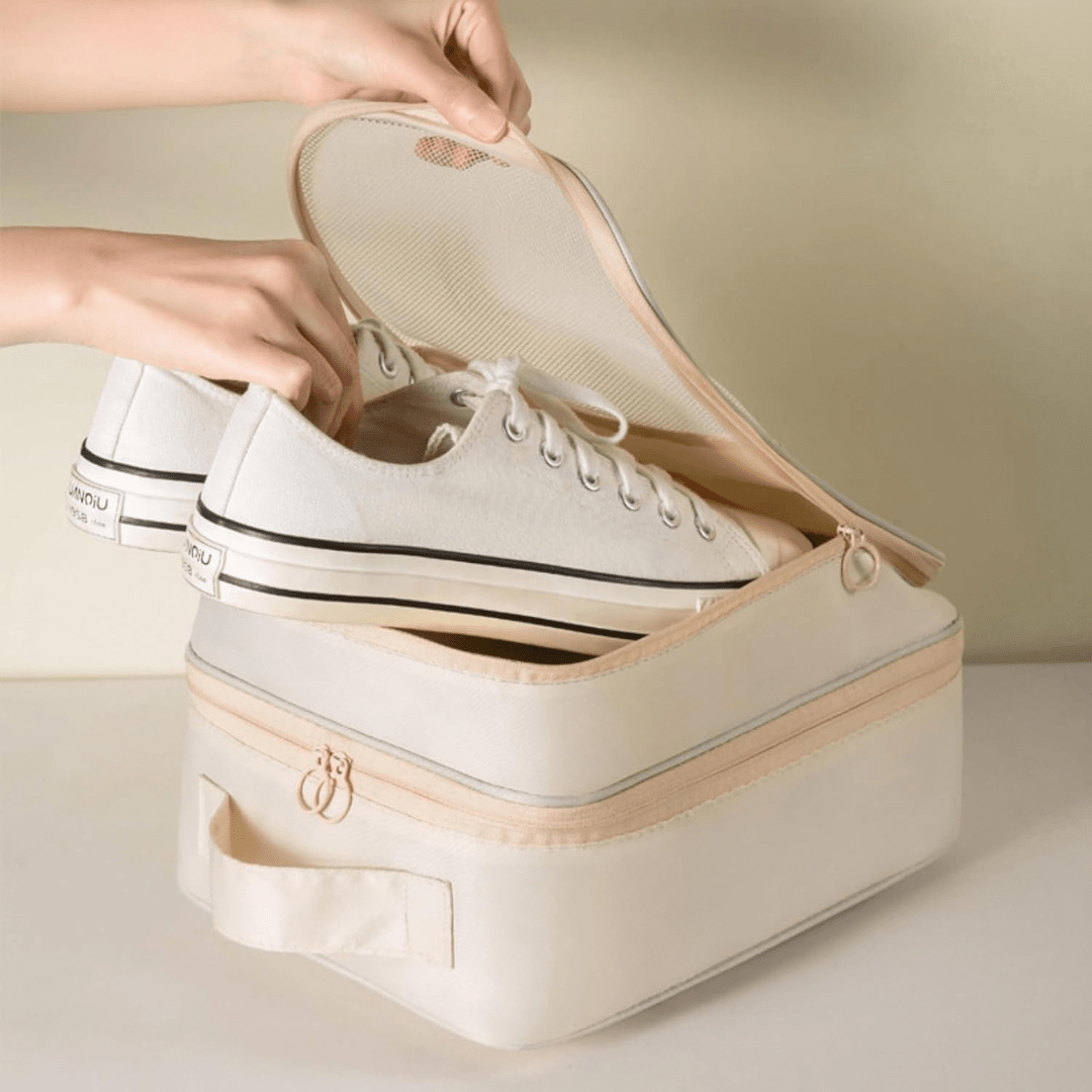 Ce sac de voyage comprend un grand compartiment principal pour les chaussures volumineuses (comme les baskets) et deux poches latérales en maille pour les sandales ou chaussures plates. Chaque paire est rangée séparément pour éviter le transfert de saleté, gardant ainsi votre valise plus propre et mieux organisée.